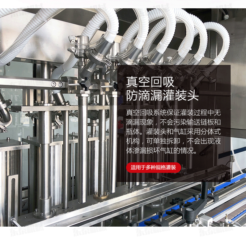 1.真空回吸系統保證灌裝過程中無滴漏現象,不會污染輸送鏈板和瓶體。灌裝頭和氣缸采用分體式機構,可單獨拆卸,不會出現液體滲漏損壞氣缸的情況。進口亞德客氣缸經久耐用,其他密封等配件使用標準件,更換維護簡單方便。
