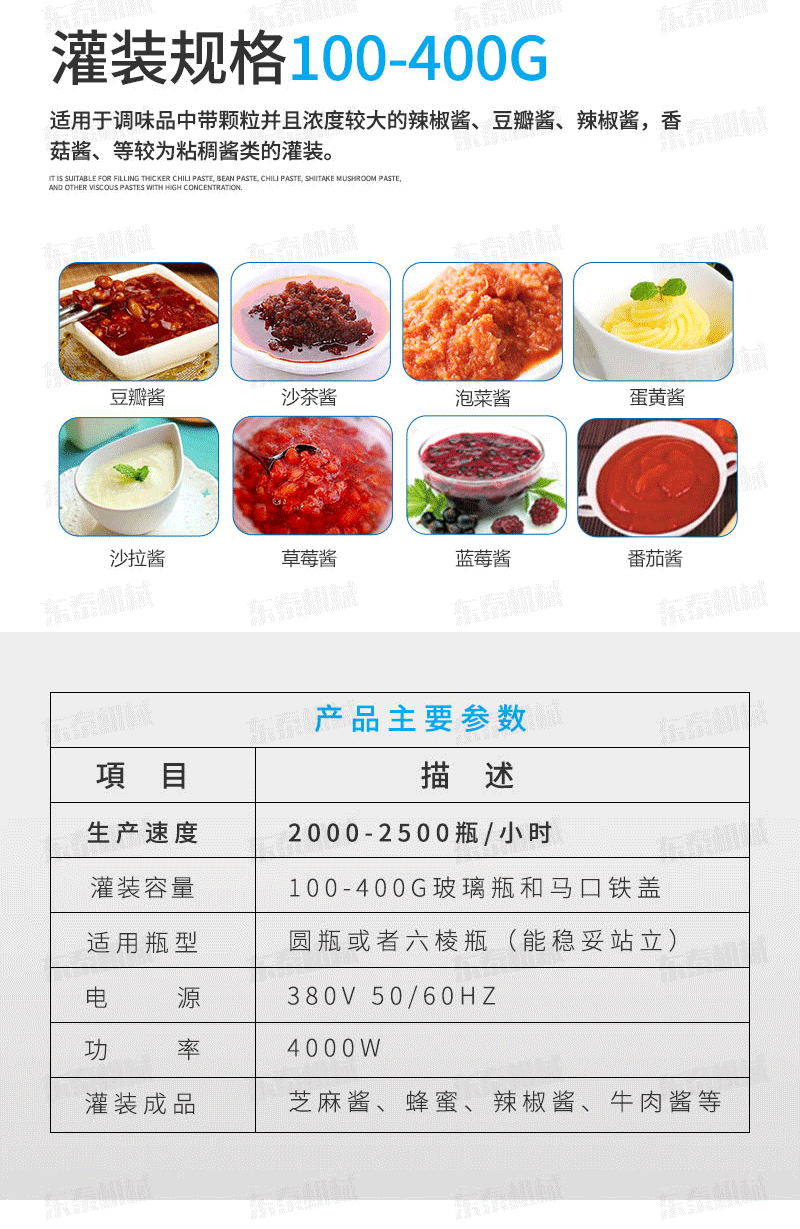 為了能夠更好的服務社會我們東泰辣椒醬灌裝機踏上了多樣化生產道路,并且現在已經有了一定的顯著成績,原來的傳統設備由于功能有所局限,只能灌裝普通的醬料,而經過我們改進后的全自動辣椒醬灌裝機能夠實現對市場上絕大多數的醬料的灌裝,尤其是那些含顆粒的顆粒漿狀流體、半流體、膏體、漿狀類的物料灌裝,如辣椒醬、牛肉醬、牛肉大醬、豆瓣醬、芝麻醬、果醬、火鍋底料的等物料的灌裝,在市場中,辣椒醬灌裝機有眾多的機會來展現出自我的風采,不僅是因為再市場中的廣泛應用,還有這十分出眾的全自動化的一鍵式的完成一系列的工作流程,更能夠凸顯出市場對于它自身的需求。