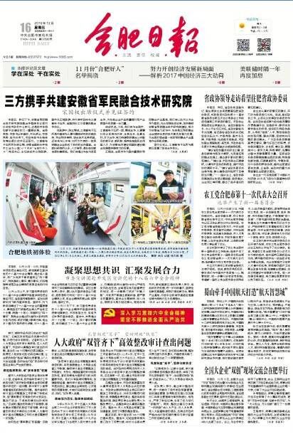 •     12月16日,中共合肥市委機關報《合肥日報》頭版專題報道由國家工信部指導、榮事達獨家承辦的全國大企業“雙創”現場交流會活動,報道中提出:本次會議,由國家工信部指導,省經信委、市政府、中國兩化融合服務聯盟、中國制造業與互聯網融合發展聯盟共同主辦,榮事達集團公司承辦,來自全國各地“雙創”領域的專家學者、業界龍頭企業代表等近400人出席了會議。會上,與會專家分別作了主題發言,央企、互聯網企業代表開展了雙創實踐經驗交流,榮事達集團作為全國制造企業的唯一代表,分享了大企業雙創實踐成果。