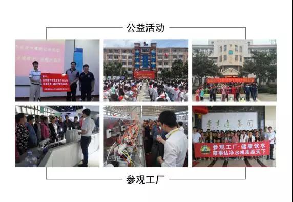 榮事達(dá)針對(duì)消費(fèi)者對(duì)凈水機(jī)了解不足的問題,長期推出“參觀工廠”活動(dòng),讓消費(fèi)者全面見證產(chǎn)品生產(chǎn)和質(zhì)檢的流程,加強(qiáng)消費(fèi)者對(duì)凈水機(jī)的種類、功能、技術(shù)的認(rèn)知,引導(dǎo)消費(fèi)者正確認(rèn)識(shí)和選購凈水機(jī)。同時(shí),關(guān)注弱勢群體,積極踐行公益,發(fā)起過“愛心傳遞 健康助學(xué)”等多項(xiàng)活動(dòng),在2015年攜手安徽省青年志愿者協(xié)會(huì)啟動(dòng)“樂享凈水”大型助殘公益項(xiàng)目,榮獲安徽省志愿者服務(wù)項(xiàng)目大賽二等獎(jiǎng),號(hào)召并帶動(dòng)更多愛心人士投入其中,樹立起公益典型,該活動(dòng)已在安徽、湖北、湖南、江蘇、江西、河南、山東、陜西、廣西等多個(gè)省份,為400多個(gè)助殘機(jī)構(gòu)及殘疾人士家庭提供公益服務(wù),捐贈(zèng)、安裝凈水設(shè)備1500多套,開展各項(xiàng)幫扶活動(dòng)、健康飲水知識(shí)講座500余次,受惠殘疾人口超過30000人;日前,為全國首個(gè)希望小學(xué)——金寨縣希望小學(xué)免費(fèi)提供了直飲水設(shè)備,發(fā)起“給山區(qū)孩子一杯水”援建金寨中小學(xué)生凈水設(shè)備公益活動(dòng),解決山區(qū)孩子飲水難題。