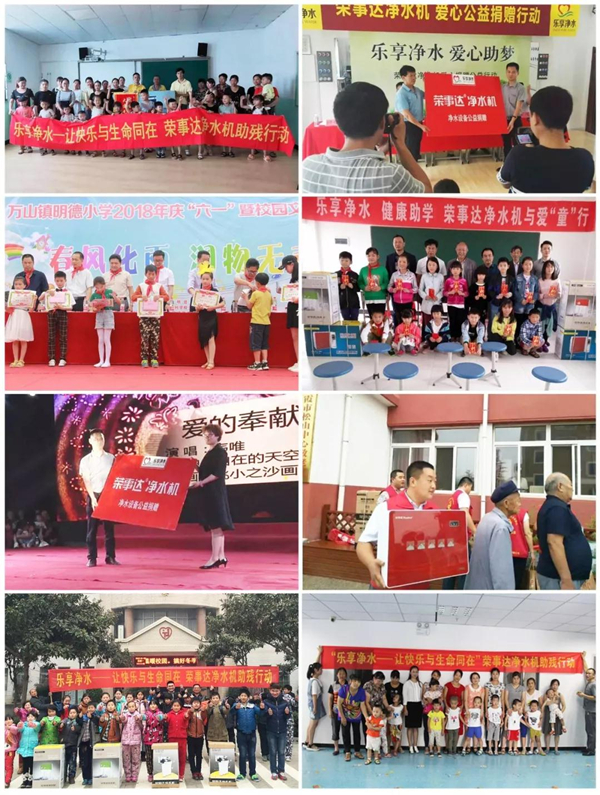 其實,早在2010年,榮事達就發起“樂享凈水”公益行動,通過開展“健康助學”、“愛心助殘”、“愛心敬老”等各類活動,走進貧困地區學校、助殘機構、敬老院等免費提供直飲水設備和志愿服務。榮事達水工業集團董事長雷鳴曾表示,榮事達的“樂享凈水”行動,更像是一個愛心紐帶,通過它可以凝聚更多代理商和社會人士的責任之心。榮事達“樂享凈水”公益行動自發起以來,志愿服務團隊已遍及安徽、江蘇、陜西、河南、河北等多個地區,捐贈、安裝凈水設備數千套,受益群體龐大,贏得了社會的一致好評,其中“樂享凈水 愛心助殘”行動更是獲評“安徽省第三屆青年志愿服務項目大賽二等獎”榮譽。