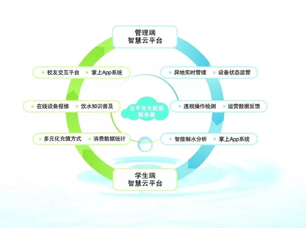 在注重產(chǎn)品品質(zhì)和工程設(shè)計(jì)的同時(shí),榮事達(dá)著眼校園直飲水的互聯(lián)網(wǎng)化建設(shè),依托先進(jìn)的云端大數(shù)據(jù)平臺(tái)、無線網(wǎng)絡(luò)體系和智能一卡通技術(shù)等,創(chuàng)新打造校園直飲水智慧管理系統(tǒng)。系統(tǒng)直連凈水主機(jī)、開水器、飲水機(jī)等終端定制設(shè)備,實(shí)現(xiàn)精細(xì)化管理。學(xué)生在使用中不僅能查詢飲水消費(fèi)記錄、在線報(bào)修設(shè)備等,還能擁有微信、支付寶等多元化充值方式選擇,充分享受快捷的智能化飲水體驗(yàn)。同時(shí)設(shè)備運(yùn)營(yíng)商也可通過電腦或手機(jī)APP端口接入云數(shù)據(jù)平臺(tái),異地監(jiān)測(cè)工程運(yùn)行狀況,實(shí)時(shí)掌握水電成本、消費(fèi)收益、設(shè)備狀態(tài)等數(shù)據(jù)信息,日常管理更簡(jiǎn)單。