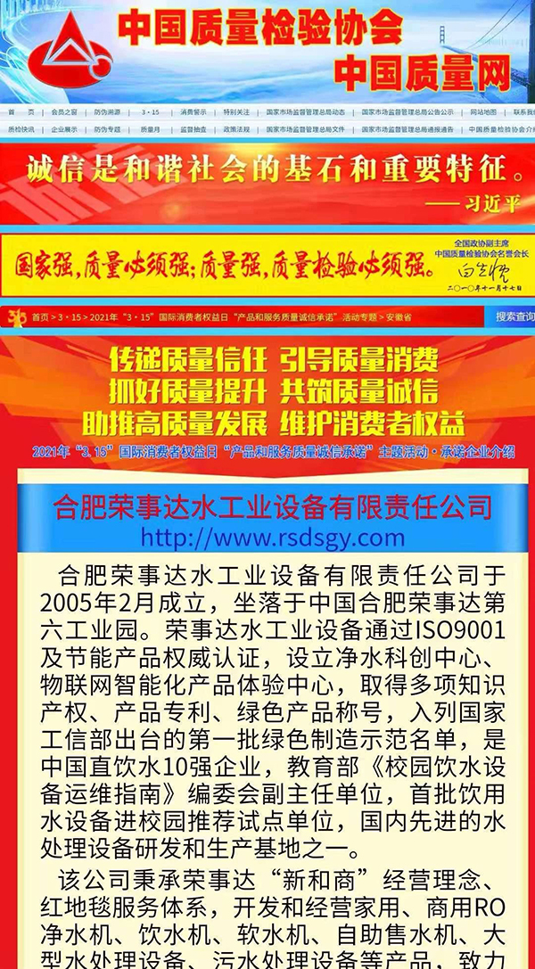 •   共筑質量誠信,引導質量消費。在由中國質量檢驗協會主辦的2021年“3.15”產品和服務質量誠信承諾的主題活動中,榮事達憑借卓越的產品品質及良好的社會形象,獲得協會以及權威專家的一致認可,榮膺 “全國產品和服務質量誠信示范企業”“全國質量信得過產品”“全國凈水行業質量領先品牌” “全國質量誠信先進企業”多項榮譽,《中國質量報》、《中國消費者報》及中國質量網、中國經濟網、中國消費網等多家媒體均予以集中展示和公告。