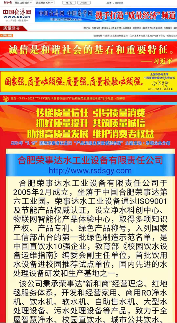 作為凈水行業領軍企業,榮事達積極響應中國質量檢驗協會“產品和服務質量誠信承諾”號召,面向廣大用戶做出相關產品和服務質量誠信承諾,體現了企業應有的社會責任和擔當。本次評選,需要對2000余家企業的誠信、質量情況進行調查,并結合社會評價,再由權威專家層層嚴格篩選專業審核。榮事達從中脫穎而出,一舉獲得“全國產品和服務質量誠信示范企業”“全國質量信得過產品”“全國凈水行業質量領先品牌” “全國質量誠信先進企業”四項殊榮,相關承諾和獲獎情況已在《中國質量網》、《中國經濟網》、《中國消費網》在線發布。該項活動也得到《人民網》、《新華網》、《光明網》、《新浪》、《搜狐》、《今日頭條》等主流網絡媒體的報道。