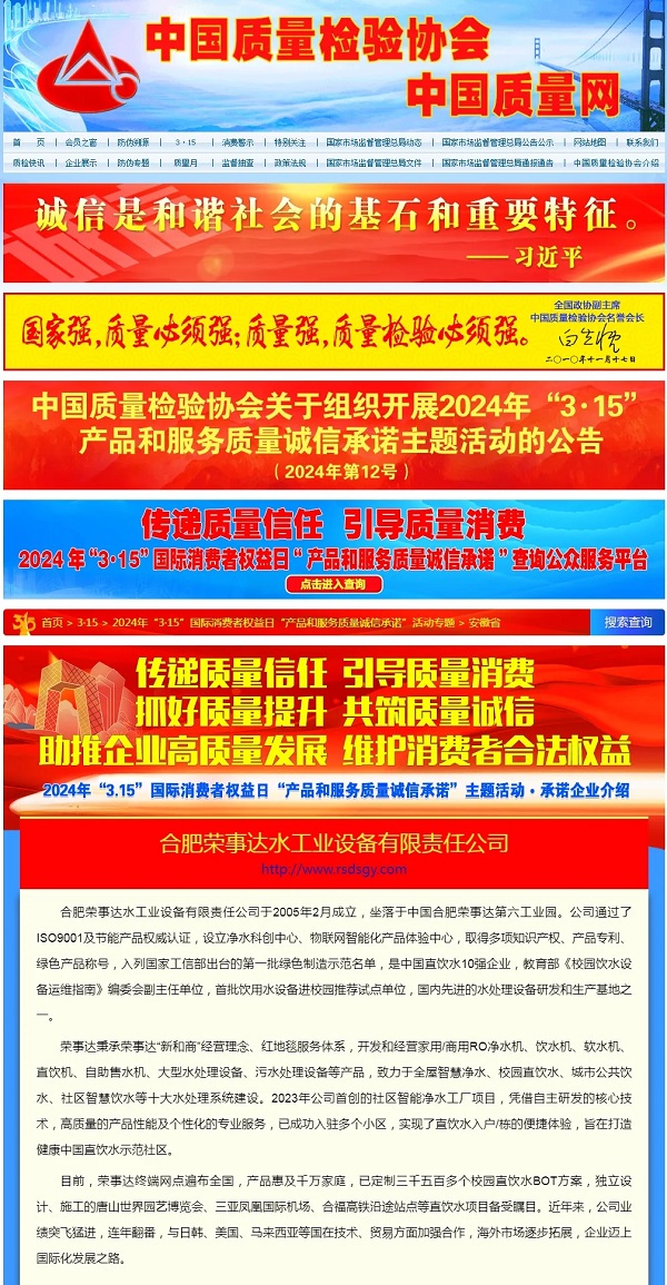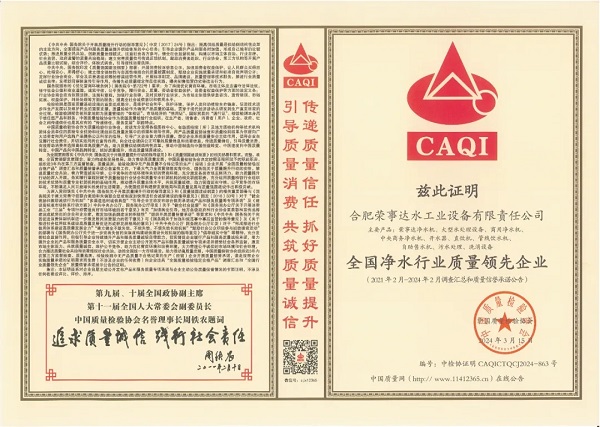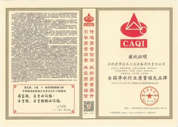 傳遞質(zhì)量信任,引導(dǎo)質(zhì)量消費。 在由中國質(zhì)量檢驗協(xié)會主辦的2024年“3·15”產(chǎn)品和服務(wù)質(zhì)量誠信承諾的主題活動中,榮事達(dá)水工業(yè)公司憑借卓越的產(chǎn)品品質(zhì)及良好的社會形象,獲得協(xié)會以及權(quán)威專家的一致認(rèn)可,榮膺 “全國產(chǎn)品和服務(wù)質(zhì)量誠信示范企業(yè) ”“全國凈水行業(yè)質(zhì)量領(lǐng)先企業(yè)”“全國凈水行業(yè)質(zhì)量領(lǐng)先品牌”“全國產(chǎn)品和服務(wù)質(zhì)量誠信品牌”“全國質(zhì)量檢驗穩(wěn)定合格產(chǎn)品”“全國質(zhì)量檢驗信譽保障產(chǎn)品”“全國消費者質(zhì)量信譽保障產(chǎn)品 ”多項榮譽。