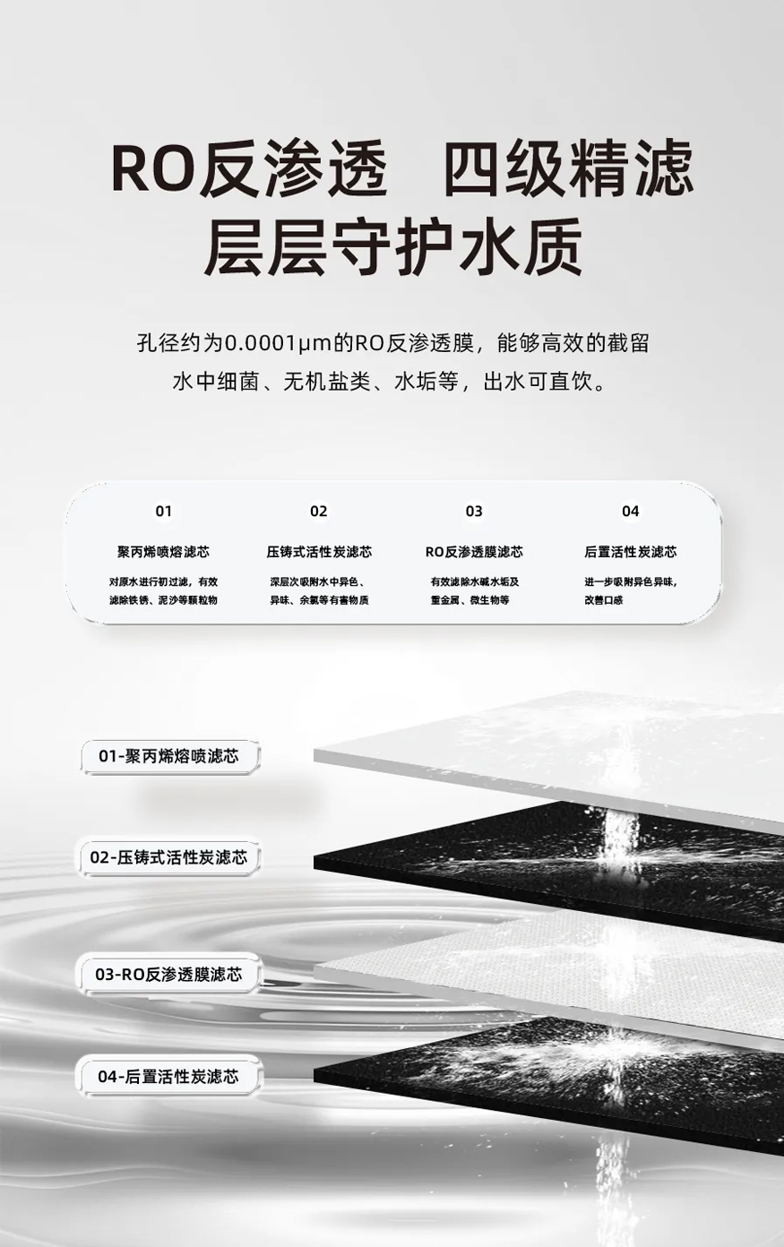 好凈水機(jī)的核心是“濾得干凈,用得省心”。新品四級(jí)精濾系統(tǒng)為自來水設(shè)四道關(guān)卡:第一道聚丙烯熔噴濾芯篩除鐵銹、泥沙,讓水變清;第二道壓鑄式活性炭吸附怪味和余氯,告別燒水異味;第三道RO反滲透膜(0.0001μm孔徑)攔截重金屬、微生物、水垢,過濾后可直飲且清甜;最后后置活性炭調(diào)口感,讓泡茶更香、煲湯更入味。