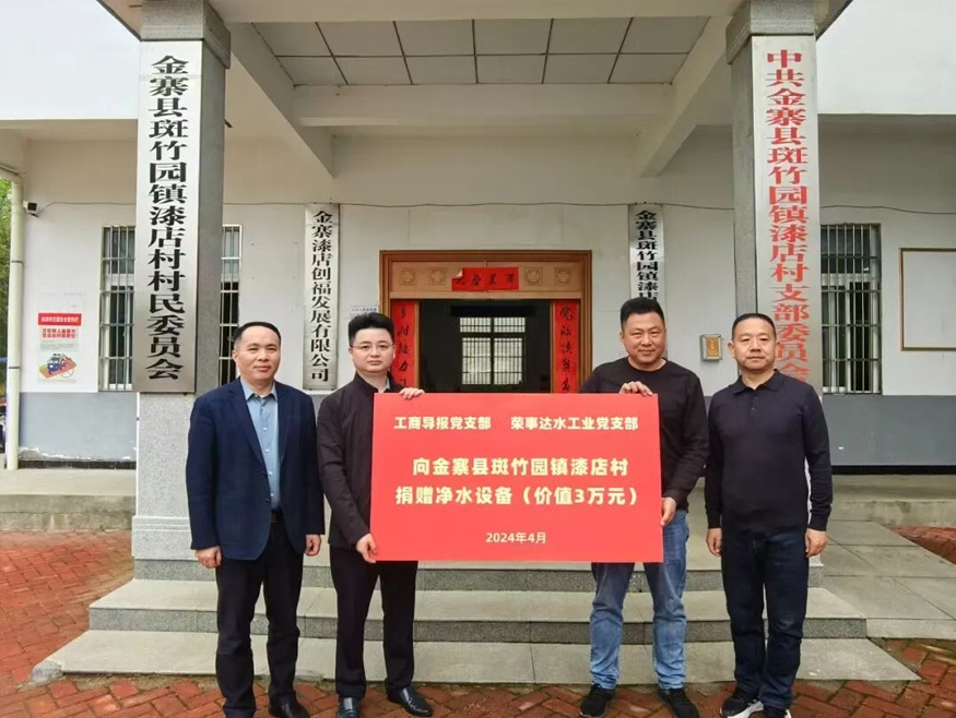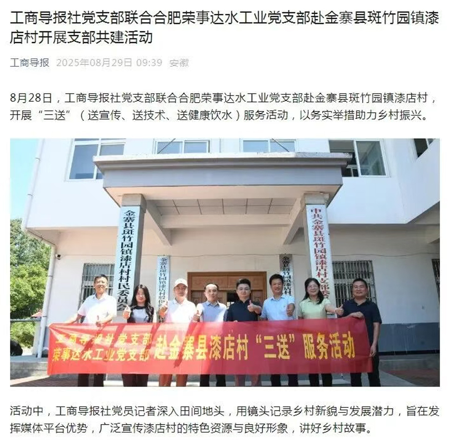 • 8月28日,榮事達水工業公司黨支部攜手工商導報社黨支部,再次走進金寨縣斑竹園鎮漆店村,開展“三送”(送宣傳、送技術、送健康飲水)服務活動,以實際行動踐行企業社會責任,助力鄉村振興。