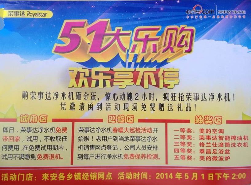 超低折扣購機——五一期間,榮事達推出了一系列購機優惠政策,消費者在當地經銷商門店或者小區推廣點購買榮事達凈水產品,可享受超低折扣。