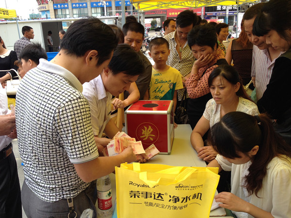 “小姑娘,我先來的,你先把我買的機(jī)子的錢收掉好讓我去抽獎,說不定我能抽一臺空調(diào),一份錢買兩樣好東西呢”,已經(jīng)挑好產(chǎn)品的王阿姨急切地叮囑著工作人員。活動開始后不久,收銀臺前就圍了一圈又一圈等著付款的消費(fèi)者;抽獎臺前也排著等候抽取大獎的長隊(duì),好不熱鬧。
